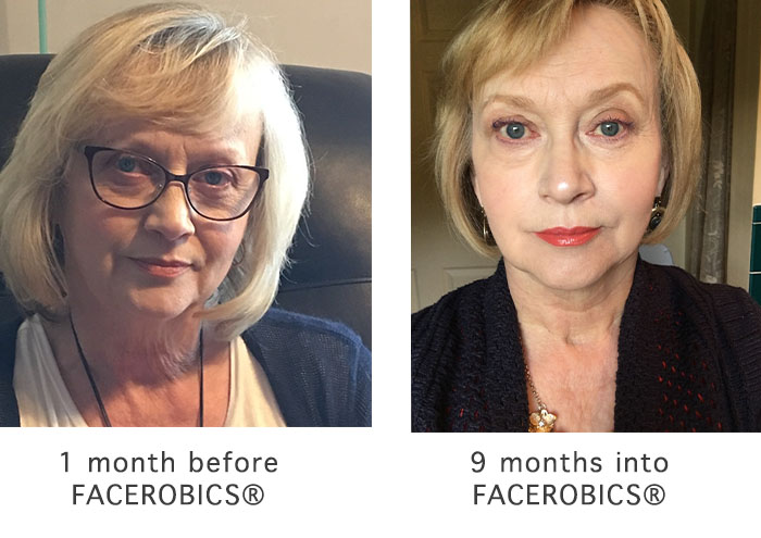 I began Facerobics in August, 2018 – the day after my 65th birthday. My eyes were the first to show improvement after 9 days. I had become shy about laughing in front of people because my nose was beginning to droop when I smiled; however, by the time I completed Series 1, Level 1, my nose had already lifted.